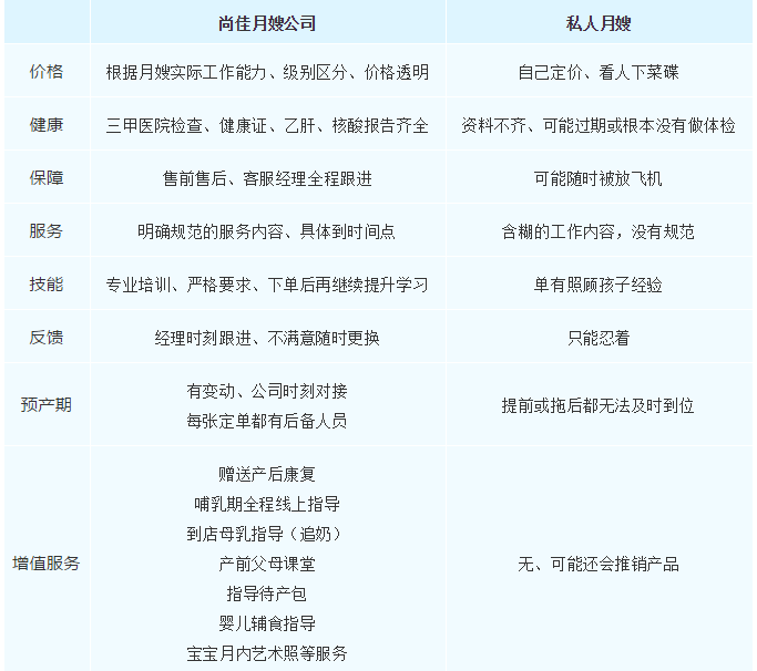 經(jīng)過(guò)這次輾轉的請月嫂路,我做了張私人月嫂跟公司月嫂的對比表格,可以給其他像我一樣需要請月嫂的家庭做了解