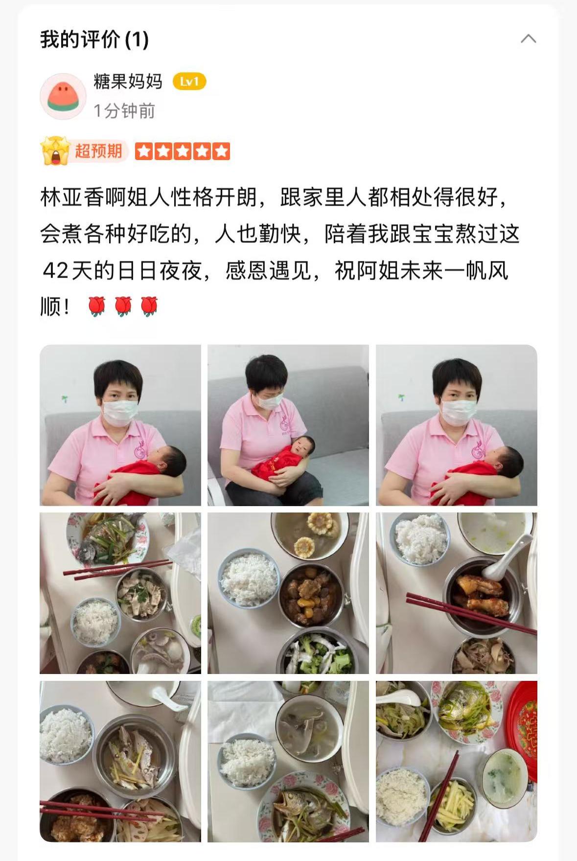 林姐細心呵護寶寶和寶媽?zhuān)×纸阕o理手法很專(zhuān)業(yè),月子餐做得很美味,合客戶(hù)胃口,能夠吃苦耐勞,擅于和客戶(hù)溝通。
