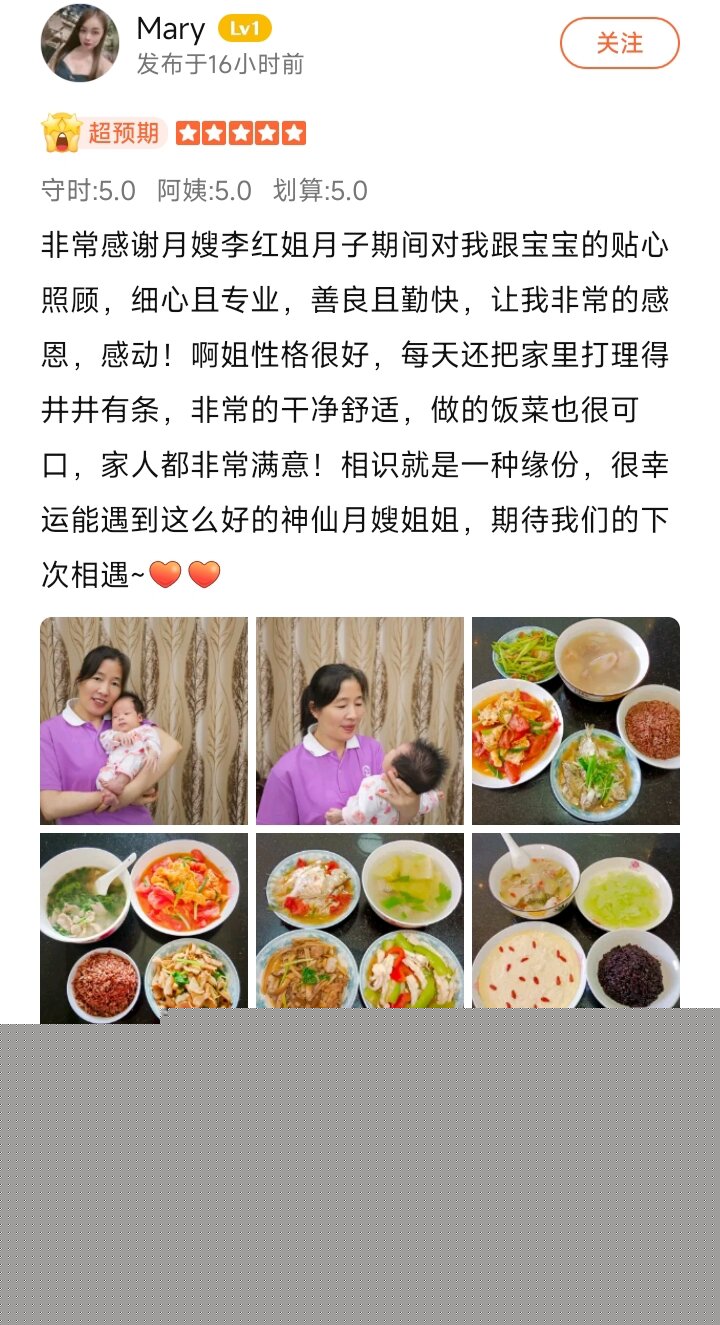 李紅來(lái)自湖南,在潮汕做月嫂已有多年,紅姐最大的特點(diǎn)就是性格溫和,對寶媽關(guān)心有佳,并且護理的也很細心,不管是對寶寶還是對寶媽?zhuān)寄芗毿恼樟?,注重細節,溝通能力好,做的月子餐也是具有潮汕風(fēng)味!